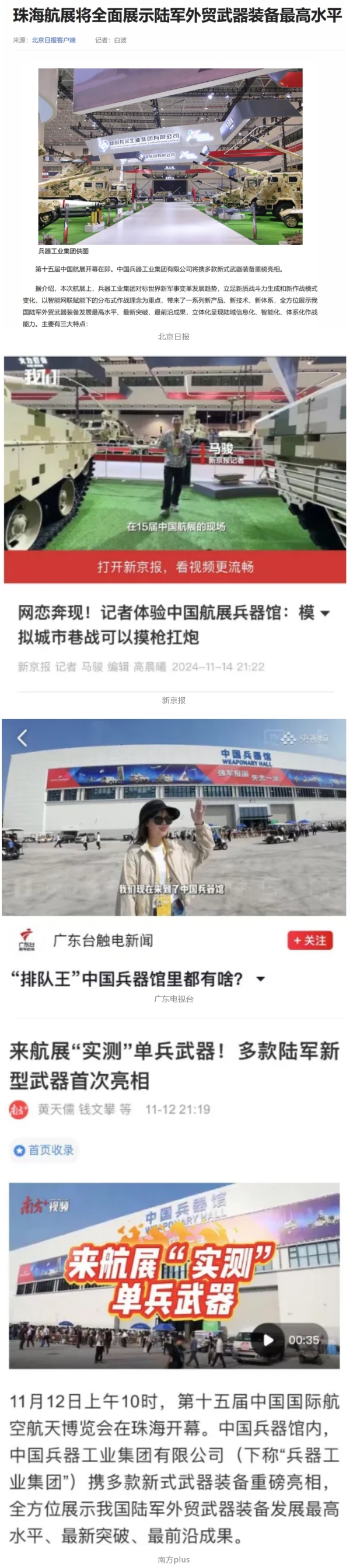 新華社、央視新聞、中央廣播電視總臺中國之聲、央視軍事、中國軍視網(wǎng)、廣東廣播電視臺等媒體以及國家國防科工局、國資小新等到兵器工業(yè)集團(tuán)地面動態(tài)演示區(qū)、中國兵器館進(jìn)行了直播。