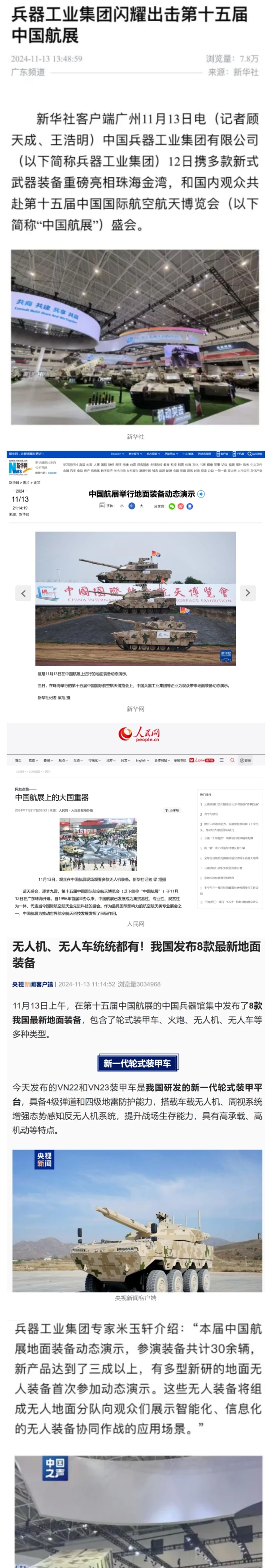 11月12日至17日,第十五屆中國國際航空航天博覽會在廣東省珠海市舉行,中國兵器工業(yè)集團(tuán)有限公司突出數(shù)智賦能軍貿(mào)合成旅作戰(zhàn)體系,帶來了一系列新產(chǎn)品、新技術(shù)、新體系,全方位展示我國陸軍外貿(mào)武器裝備發(fā)展最高水平、最新突破、最前沿成果,立體化呈現(xiàn)陸域信息化、智能化、體系化作戰(zhàn)能力,受到了全社會廣泛關(guān)注。航展期間,央視綜合頻道《新聞聯(lián)播》、央視新聞頻道《新聞直播間》《長空鵬程》報道兵器工業(yè)集團(tuán)參展情況,重點(diǎn)介紹了VT4A1主戰(zhàn)坦克、輪式裝甲火炮、新一代陸域指控信息系統(tǒng)、無人戰(zhàn)車、民用無人運(yùn)輸機(jī)及地面裝備演示有關(guān)內(nèi)容。央視新聞推出航展直播節(jié)目《藍(lán)天之約》,邀請兵器工業(yè)集團(tuán)嘉賓對參展情況、裝備動態(tài)演示作了講解。