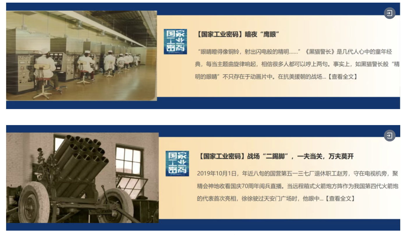 兵器工業(yè)集團參與國務(wù)院國資委新聞中心聯(lián)合新華網(wǎng)、云聽APP、喜馬拉雅APP、機械工業(yè)出版社推出的《國家工業(yè)密碼》——有聲故事網(wǎng)絡(luò)互動傳播活動,刊發(fā)《暗夜“鷹眼”》《戰(zhàn)場“二踢腳”,一夫當關(guān),萬夫莫開》。